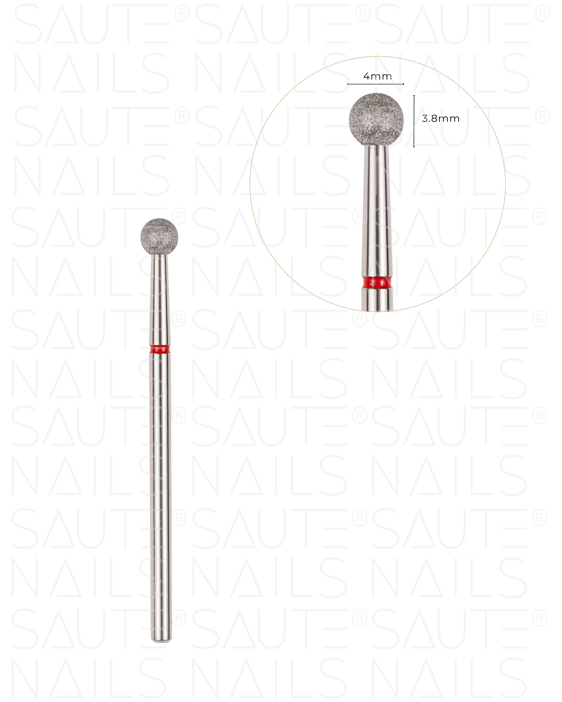 Coupe-cuticules diamanté en forme de boule. Sa tête a un diamètre de 4 mm, ce qui permet une élimination précise et douce des cuticules sans risque d'endommager la plaque de l'ongle. La longueur de la partie travaillante est de 3,8 mm, ce qui suggère que la fraise est conçue pour un travail particulièrement précis sur de petites surfaces.